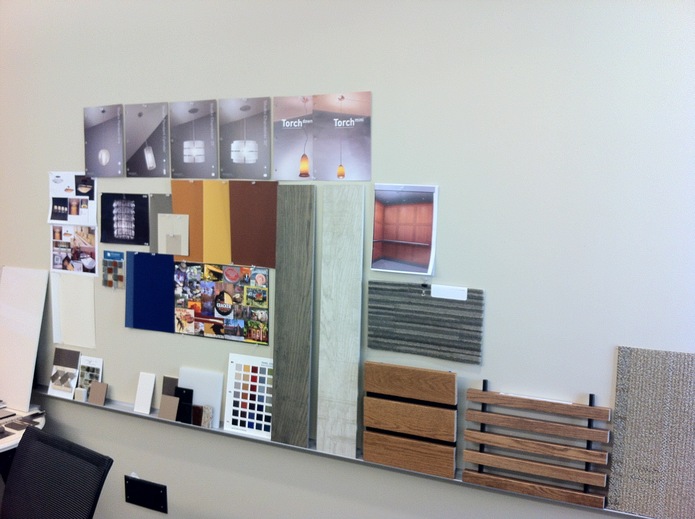 The picture I am sharing today shows the meeting we held with the architects when they pulled all the conversations and ideas we had thrown at them together and produced a whole range of materials and color concepts for us to see and touch to start narrowing down how the interior would look. For every element that needed to be installed, we would have several options. By producing this display of swatches and samples we could place them next to each other to see how they worked, or even walk on the flooring samples to see how they felt, whether they would be robust enough to stand up to the rigors of being used every day, or whether they looked the same in real life as they had in the brochures we originally used.
