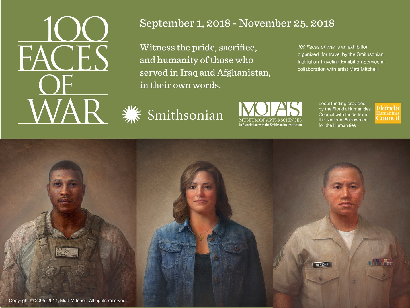 Bringing the military portraits in 100 Faces of War, a traveling exhibition from the Smithsonian Institution, with local funding for this program provided through a grant from the Florida Humanities Council with funds from the National Endowment for the Humanities, into context with the Museum's art collections, MOAS will bring the noted Army art curator, Renee Klish, the former Army art curator at the U.S. Army Center of Military History to lecture on her publication, "The Art of the American Soldier." This publication accompanied an exhibition mounted in 2011 in Washington D.C. based on the more than 15,000 paintings and sketches created by over 1,300 American soldiers in the line of duty. With no national museum to display this impressive collection, these works have remained in curatorial storage in Washington D.C. for decades, seldom made available for public viewing. With section headings such as, "A Soldier's Life," "A Soldier's Duty," "A Soldier's Sacrifice," and "The American Soldier," Ms. Klish will give a slide lecture on the history of the Army art program, from its origins in World War I through its current incarnations in Afghanistan and Iraq.