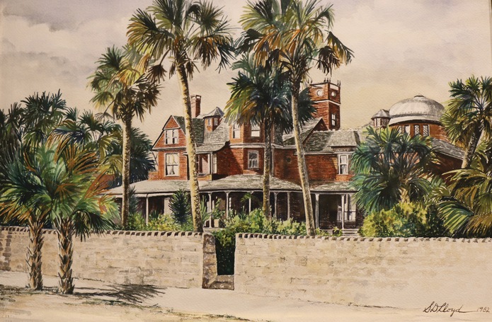 The painting of the Burgoyne House takes us back in time when Daytona, which became Daytona Beach in 1926, was a small quaint city of fewer than 2,000 people. Charles and Mary Burgoyne traveled here in 1894 from New York City by way of the new Henry Flagler railroad. They fell in love with the city and decided that it was where they would retire. The first house that they had built was a large distinctive beach house with a wonderful ocean view at the corner of Broadway and Atlantic Avenue. In 1896, they began construction on their second Daytona house located on the mainland. This was a Queen Anne style mansion and was the largest and grandest home in the city. The property included most of the block of North Beach Street from Bay Street to Volusia Avenue, now known as International Speedway Boulevard, and Palmetto Avenue. The home was designed by Sumner Hale Gove, a prominent local architect, and was built by G.H. Bliven. It was constructed of wood and coquina. Sumner Hale Gove owned a coquina rock quarry and used this long-lasting stone in many of the houses he designed. The mansion was decorated with turrets and stained glass windows and locals called it "The Castle".