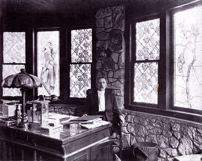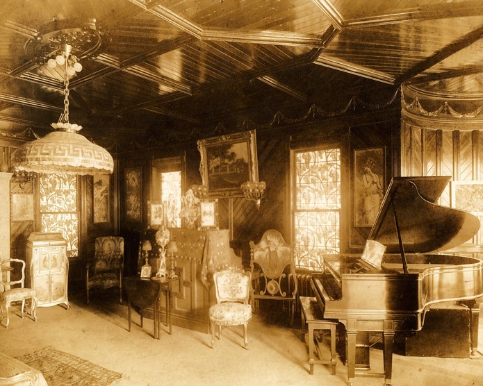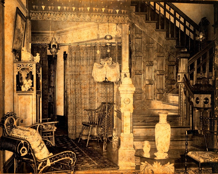 A large artisan well was drilled and a water tower constructed. A bog wall was built along the perimeter at the suggestion of Mr. Gove as Charles Burgoyne had a fear of snakes. The small pieces of rock for the wall’s construction were gathered from the open area west of Daytona, now known as Nova Road, and brought to the construction site by mules and wagons. There were two gates in the wall, one facing Beach Street, and the other facing Palmetto Avenue. The inside of the mansion was furnished with the finest Victorian furniture, original oil paintings, Persian carpets, Tiffany lamps, and elaborate silver tableware. The ornately carved woodwork was used throughout the house. The downstairs walls and ceilings were decorated with murals painted by an Italian artist.