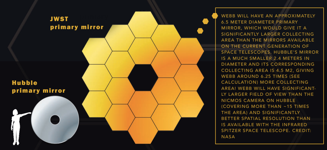 Finally, to capture this faint light, Webb was built with 18 individual hexagonal mirrors made of gold-plated beryllium (a very lightweight metal, able hold shape at the coldest of temperatures) that altogether form Webb’s now iconic honeycomb shape, a reflective surface area of 21- feet across, which is nearly three times the size of Hubble. A gold coating was utilized since it is a good reflector of infrared.