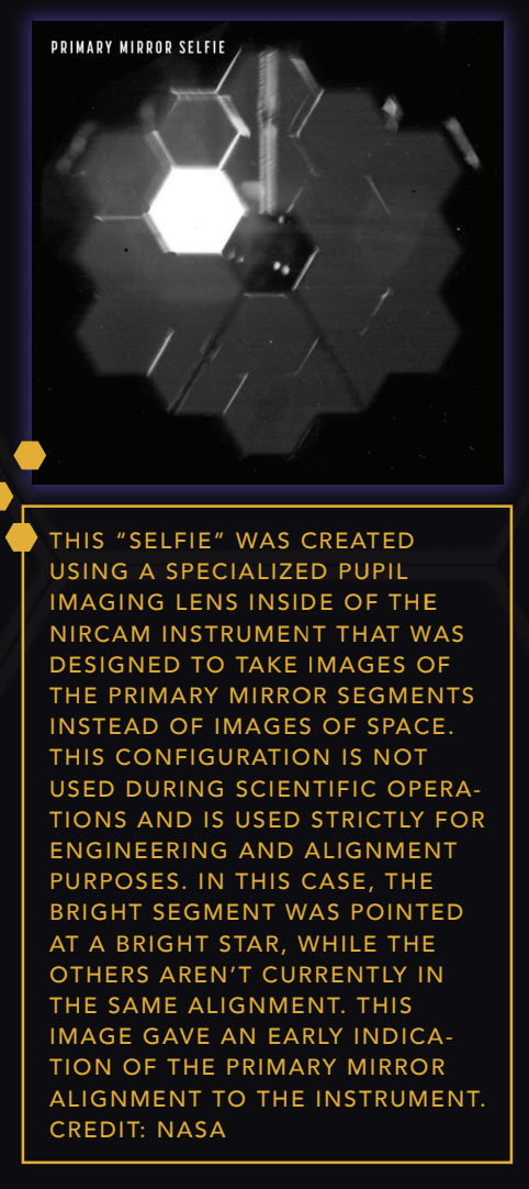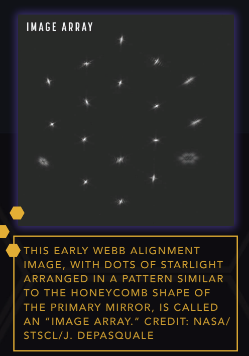 Mirrors aligned! - The excitement of December's Launch and subsequent deployment has brought on “Webb mania,” where journalists, educators, and social media personalities, have been anxious to see what’s next with Webb! Over the next few months, NASA will continue to conduct several checkouts with the observatory’s optics and have already aligned each of the 18 mirrors, pointing Webb at a single bright star to demonstrate that the observatory can acquire images. It's already shaping up to be an incredible journey as the primary mirror segments align to work as a single unit, and we’re already able to see some interesting kaleidoscope-like images showing up from 18 distorted reflections of the same star!
