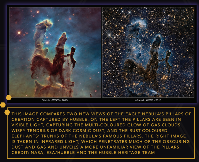 Beyond the light of Hubble - An evolution from the Hubble Space Telescope (HST), Webb will see farther than ever before, capturing the faintest light in the sky. Webb will focus on a band of the electromagnetic spectrum from within the visible red wavelength of light (0.06 microns) to the mid-infrared (28 microns). This distinction as an infrared observatory is important, as at these wavelengths we will, for the first time, be able to see into the early universe and beyond the veil of cosmic clouds and into the heart of stellar forming nebulae.