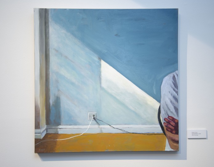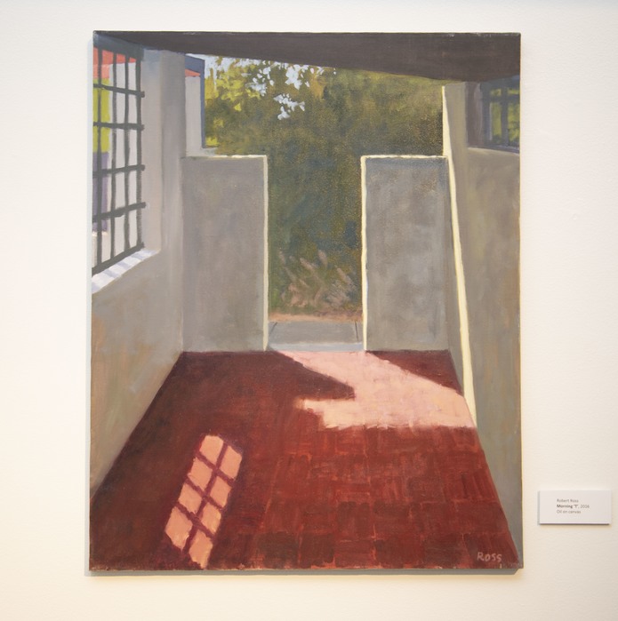 I am drawn to shapes and the spaces between them. After painting for several years, I noticed that a common motif in my paintings involves two or three strong shapes with lots of space between them. It’s almost as if my paintings are about the gaps between things, spaces that are filled with a sense of expectancy. I find most of my subjects when I’m walking around or driving. I identify with places that are simple, quiet, overlooked, even hidden. In my paintings, I look for ways to create drama and mystery. I see the ordinary as beautiful. In a way, it’s a spiritual motivation. Sometimes it feels like I’m praying with paint, not words. During the quarantine for Covid-19, I’ve been interpreting my life indoors, so I’m painting in the kitchen, bathroom, bedroom, living room, and balcony. Those paintings are on my website (www.robertrossart.com) under the heading “Dispatches from an Interior.”