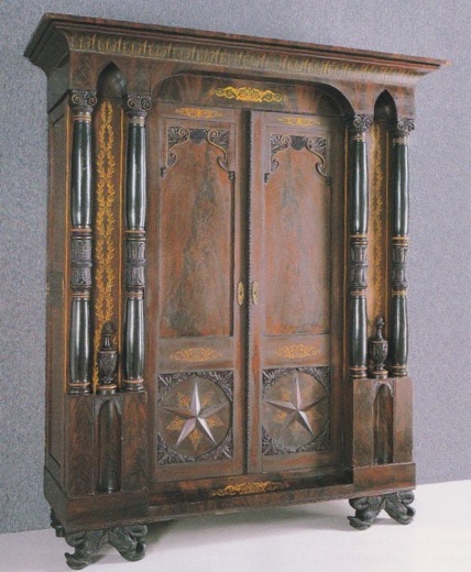 Quervelle is credited with popularizing the Empire-style on America’s eastern seaboard. In America, free from the trade guilds and rules in Europe, he perfected his own impressive Empire forms. Many of these traits can be observed in the wardrobe on display at the Museum. The double-door mahogany wardrobe is a one-of-a-kind commissioned piece and is considered one of his grandest and most impressive pieces. Fully carved with dolphin feet and gilt painted vines, this wardrobe is fully fitted with banks of drawers and closet units.
