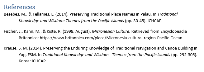 Micronesia was first settled approximately 3,500 to 2,000 years ago. Cyclones and other storms have made archaeological investigations difficult on the small islands as they disrupt the landscapes, which have created gaps in many of the island’s histories. In response to this inconclusive timeline, language has provided a better understanding of how these cultures and people have evolved on the islands. Oral traditions on each island have helped preserve many of the specific and unique cultural legacies. Palau has the tradition of place names; place names embody rich knowledge of migration and settlement patterns. Each place has a unique story behind it, and the knowledge is passed down through oral histories, events, and cultural lessons to people and children. Palau’s creation story is known as The Legend of Uab, and each area of Palau has stories relating to the legend (Besebes & Tellames, 2014). Other islands in Micronesia use songs, dances, the recitation of myths, tales, and poetry to pass along traditional knowledge.
