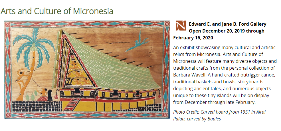 The collection that the Museum of Arts and Sciences will be exhibiting showcases many art forms from across Micronesia. Objects range from canoe related artifacts to hand-woven fiber crafts such as fans, mats, baskets, and everyday items used on the islands. Storyboards from Palau and Yap depict traditional scenes from stories that were once carved in to beams and gables of large men’s houses, also known as bai. Arts and Culture of Micronesia will provide a very brief, but vibrant, insight into the unique people and cultures of these fascinating islands.