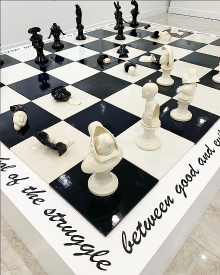 A selection of ceramic murals and other works by some of Miami's best known Cuban artists working today, including a monumental chess set made of fired and glazed clay by the artist Ivonne Ferrer. Image Credit: Yvonne Ferrer, Humanity's Gambit, fired and glazed ceramic.