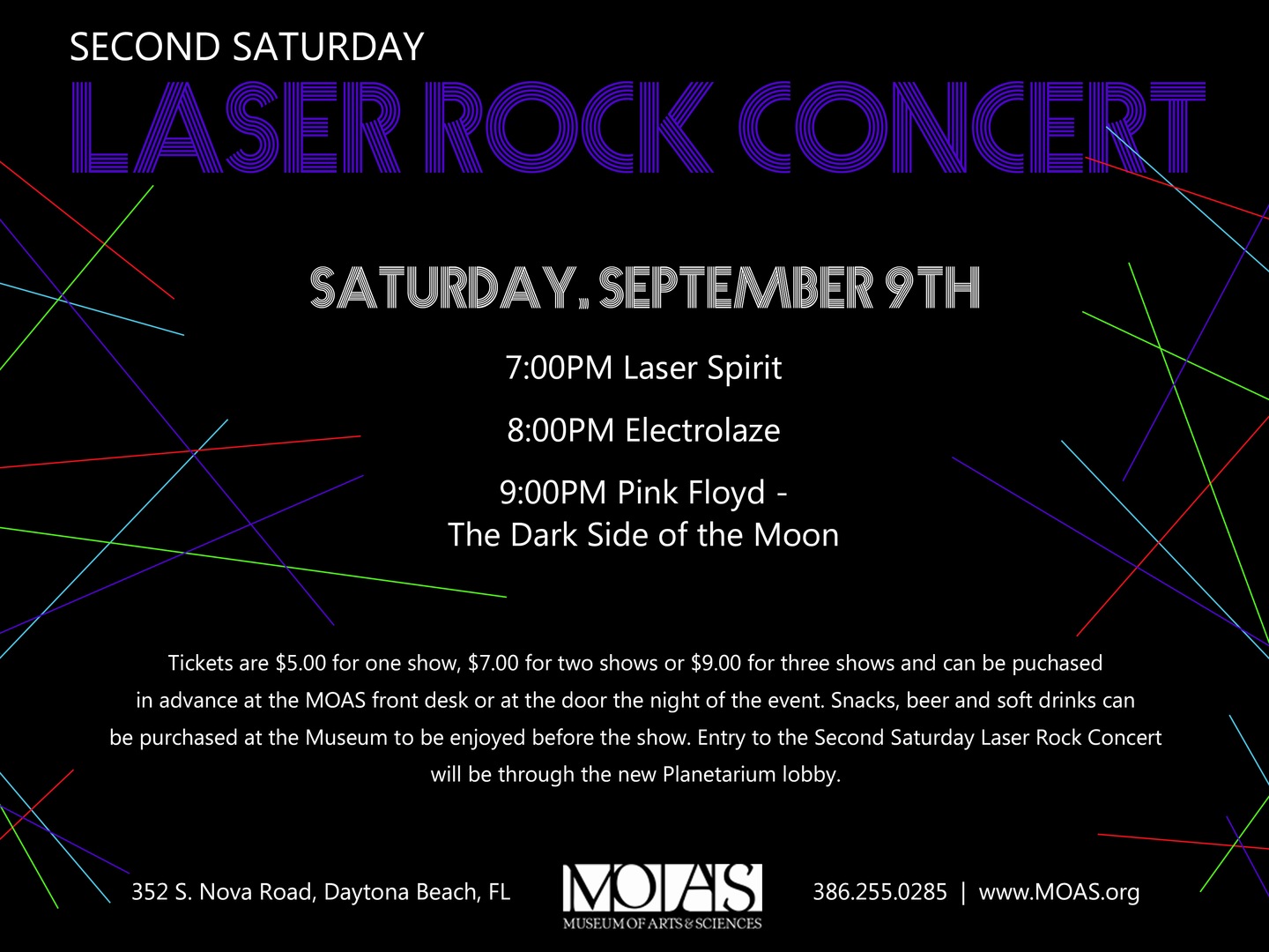 Join us monthly for a Second Saturday Laser Rock Concert in the MOAS Planetarium! Second Saturday Laser Rock Concert tickets can be purchased the week of the show at the Museum's guest services desk or at the door the night of the event. Entry to the show is through the Planetarium lobby entrance. Seating for these concerts are limited. Snacks, beer, and soft drinks can be purchased at the Museum to be enjoyed during the show.