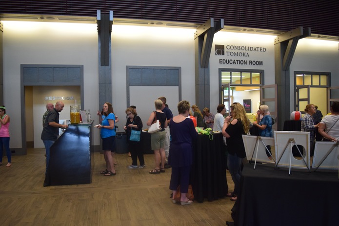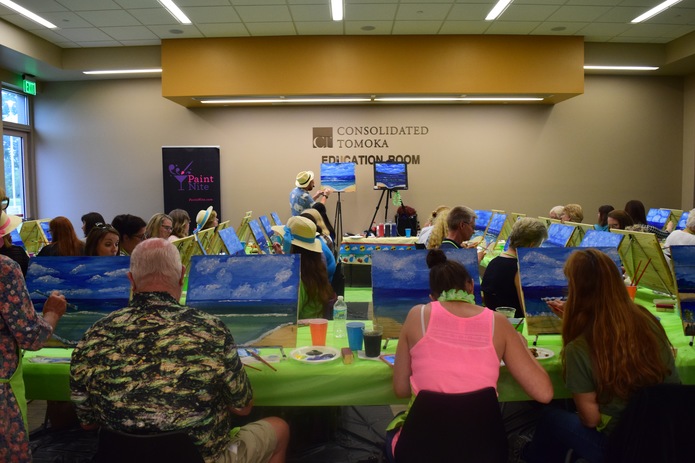 After touring the Museum, everyone made their way into the painting area tapping their feet to the sound of Florida summer tunes, like Jimmy Buffet. Each seat contained leis and straw hats to add to the tropical Florida theme. Paint Nite instructor, Johnny Yarbrough, led an entertaining class through the first half of the painting before encouraging everyone to stand up and stretch and of course, give away some great raffle prizes. By competing in games like Categories and of course Karaoke, participants could win raffle prizes like Paint Nite vouchers and gift cards!