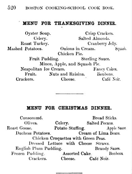 This image is from the 1896 edition of the Boston Cooking-School Cook Book, the first edition being printed in 1893. It was written by Fannie Farmer a graduate of, and eventually head of, the Boston Cooking School. Farmer’s heavily detailed and expansive cookbook became a crucial reference not long after it was first published. It defines different techniques and explains recipes in detail. The book also provides sample menus for different days or events. Seen here are the sample menus for Thanksgiving and Christmas. Ordered from top to bottom: appetizers to desserts. There are some familiar items, the roast turkey, cranberry jelly, etc. But there are more items that are likely unfamiliar to a modern American audience. Roast goose and mince pies have lost their place on the modern American table. The Christmas goose is likely only familiar to many Americans as something from Charles Dickins' stories. But the goose was once the proper centerpiece of the Christmas table. There have been many reasons given for the goose’s downfall from it being more difficult to cook to a general prejudice against the bird. One of the most likely reasons, however, is that by the 1930s and 1940s farmed turkeys were being bred larger and cheaper than geese. Mince pies, or mincemeat pies, date back to the 14th century in England. The filling is a mixture of dried fruits, brandy or other alcohol, and meat. Farmer’s recipe calls for lean beef, but other recipes use hog feet or ox tongue. Though meatless versions were popular as well and remain so in some places particularly in Britain.