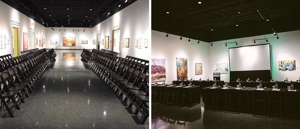 The West Wing Main Hall is the newest and largest rental space at the Museum of Arts & Sciences. The Main Hall was designed to hold ceremonies, receptions, or private corporate dinners. This space can easily accommodate large groups and presentations and can be combined with the rental of the adjacent Lobby for pre-event receptions or cocktail hours.