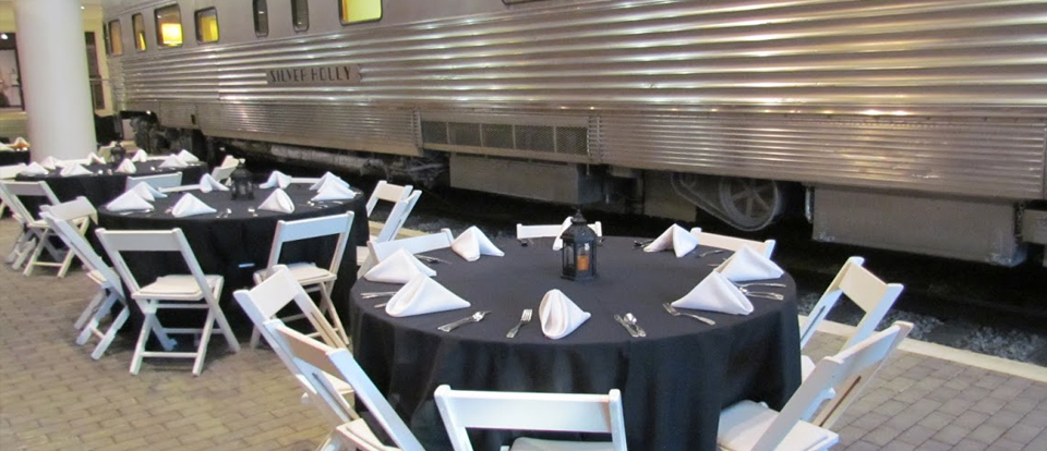 The Root Family Museum Train Station at the Museum of Arts & Sciences has been newly enclosed and remodeled. This unique space is perfect for any social event or seated dinner featuring two trains outlining the event space and large columns down the middle giving you the true feeling of being inside a real train station.