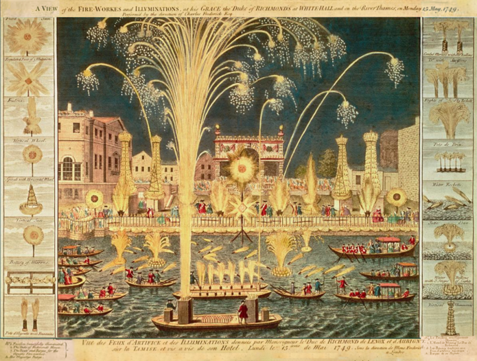 The popularity of fireworks created a new career option, the pyrotechnician. During the early days of pyrotechnics in Europe they were sometimes called green men because they wore fresh leaves on their heads and clothes to protect themselves from stray sparks. In 1739 the Ruggieri family moved from Italy to France to work as the pyrotechnicians to King Louis XV. The Ruggieri family’s large displays were known for their theatrical nature which made them quite popular among European royalty. Several members of the family would travel to different European countries to work including across the channel to George II’s court. Ruggieri’s company survived every subsequent major political and military event in France including the fall of the monarchy they came to serve. The company is still active today.