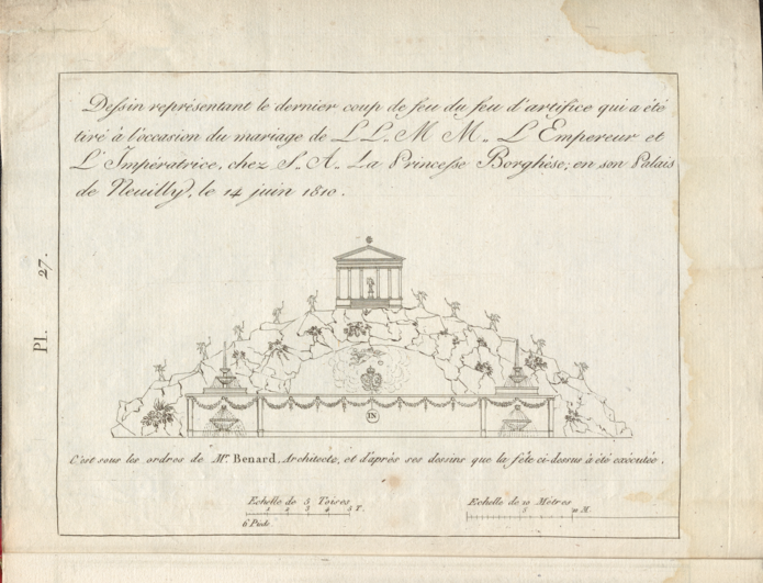 Claude Ruggieri (1777-1841) is one of the better-known members of the Ruggieri family. This is at least in part due to his prolific experiments with rockets and fireworks. Ruggieri was particularly invested in developing unique and bright colors. Along with these experiments he created specialized casings and display elements. He published three works detailing his findings and how he implemented them. His 1811 book Elémens de Pyrotechnie includes descriptions of the display he created for Princess Borghese, Pauline Bonaparte, at her palace in Neuilly in honor of her brother Napoleon’s second marriage. The display was scheduled for June 14th in 1810 as part of a series of celebrations in the couple’s honor. It included some similar elements to the display from four days before. A temple of Hymen stood elevated at the center, the surrounding area included “palm trees” that would shoot out green fireworks in place of the palm fronds, and centered below the temple two portraits of the couple would be revealed. According to later writings by Ruggieri this was when he first used the green fireworks he had developed.