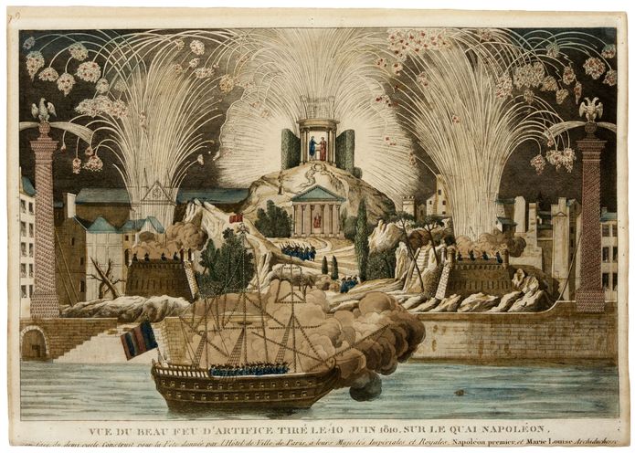 In our recent exhibit, “In the Style of the Emperor” was the print titled “DECORATION DU FEU D'ARTIFICE DUNNE PAR LA VILLE DE PARIS” (A DECORATION OF FIREWORKS BY THE CITY OF PARIS) which shows the set-up location for an elaborate fireworks display given on the occasion of the marriage of Napoleon to his second wife Marie-Louise. Firework shows like this were immensely popular at the time and were the result of centuries of development. In honor of the fireworks displays we’ll all be seeing on the 4th of July we’ve decided to examine the history of fireworks displays through the lens of this piece.