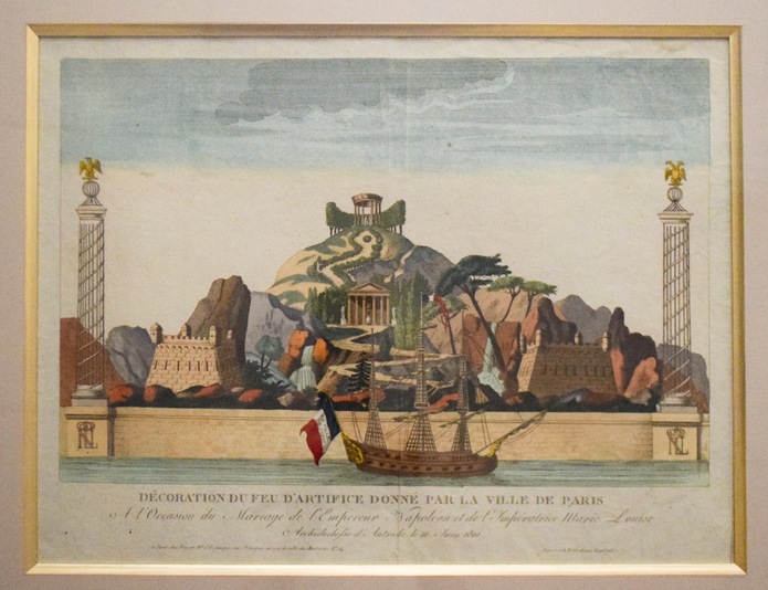The city of Paris continued to host massive events celebrating the marriage of Napoleon I and Marie-Louise throughout the month of June in the year 1810 and our print in the MOAS collection documents one of the most extravagant. The print, DECORATION DU FEU D'ARTIFICE DUNNE PAR LA VILLE DE PARIS (A DECORATION OF FIREWORKS BY THE CITY OF PARIS), shows the set up during the day on June 10th. The display included theatrical elements employing around 500 actors. It was split into three parts with the first being a mock battle between the two columns. The battle ended when the ship, a representation of the city of Paris, arrived and anchored between the forts. At which point the forts “burst into flames.” This was followed by two more pyrotechnic displays; one focusing on the Temple of Peace and the next focused on the Temple to Hymen, the Greek god of marriage.