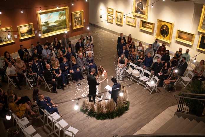 2020 was at best a challenging year for many reasons, but COVID-19 ultimately caused a worldwide shift that touched all of us in one way or another. For Brandon and Robyn, 2020 was the year they wanted to get married despite whatever difficulties might affect their plans. After their romantic engagement, the planning began to take form. They would often joke about getting married at the Museum where Brandon works as the Director of Facilities. But their real dream was to whisk away close family and friends to Sedona, Arizona for a personal wedding. Unfortunately, the COVID outbreak created a roadblock for those plans, and they needed to reshape their vision. Brandon and Robyn felt uncomfortable asking family and friends to travel and put themselves at risk. Therefore, they decided to go with what was familiar and already felt like home, the Cici and Hyatt Brown Museum of Art.