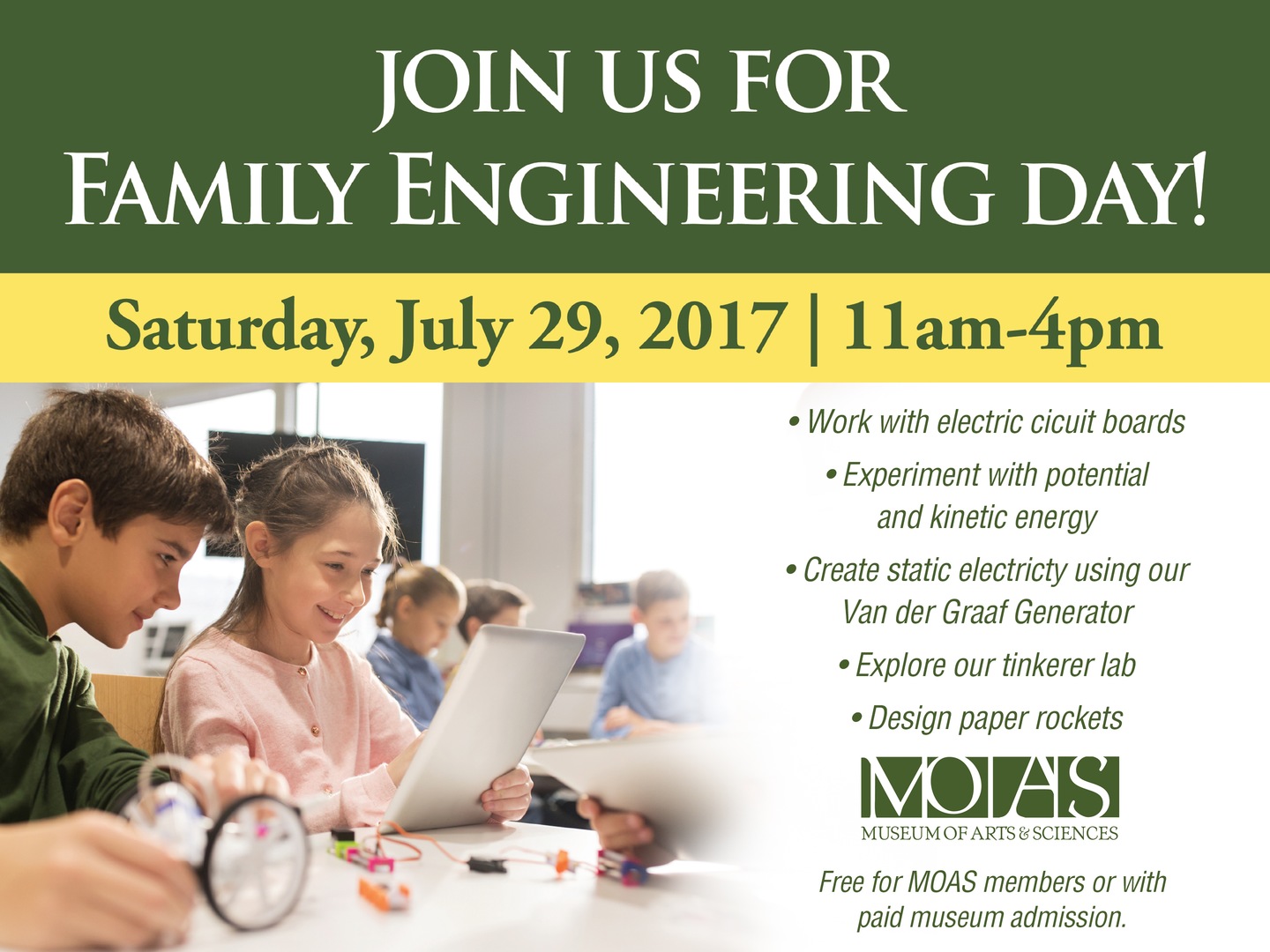 Join us at the Museum of Arts & Sciences for Family Engineering Day, in conjunction with our local Eagle Scouts! Inspire the next generation of scientists and enjoy a fun time tinkering, building, and experimenting with our many hands-on science stations. Enhance your knowledge in STEM (science, technology, engineering, and math) through hands-on learning experiences. Enjoy exploring our tinkerer lab, making paper rockets, food chemistry, and many more science stations.