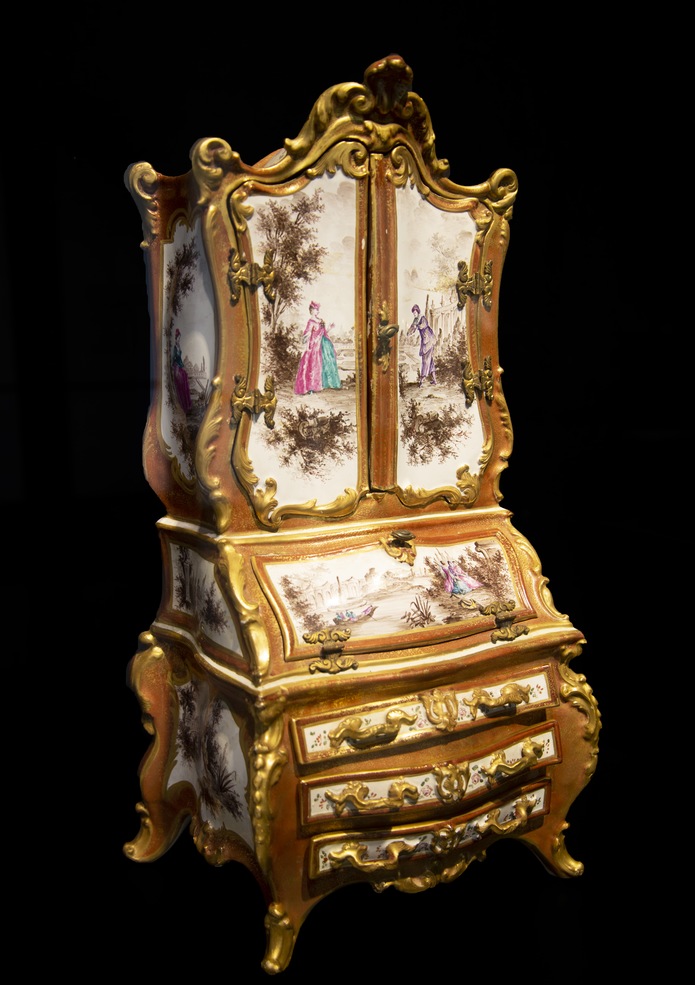 Italy, Baroque Period: One of the most unique pieces in the collection is the Baroque-Style Jewelry Cabinet, from Capo di Monte, Italy. The Capo di Monte Manufacturary, sometimes spelled Capodimonte, was known for using soft-paste porcelain.[2] Though the year is unmarked, the piece certainly falls into the archetypical category of the baroque period, known for intricately detailed and over-the-top artistic creations. The functionality of this piece sets it apart from the others since a jewelry cabinet/box might be used daily, whereas a tea set or vase might not have a use beyond being pleasing to view. Another interesting element about this piece of functional decorative art is the color choices. Along edges the signature gilding is present, but the porcelain has been enameled with a warm brown hue, leaving spaces of exposed white between gold and brown. It is also interesting that the artist used a deep brown color to sketch the scenes on the decorational panels, only coming in with bright splashes of purple, pink, and teal every so often.