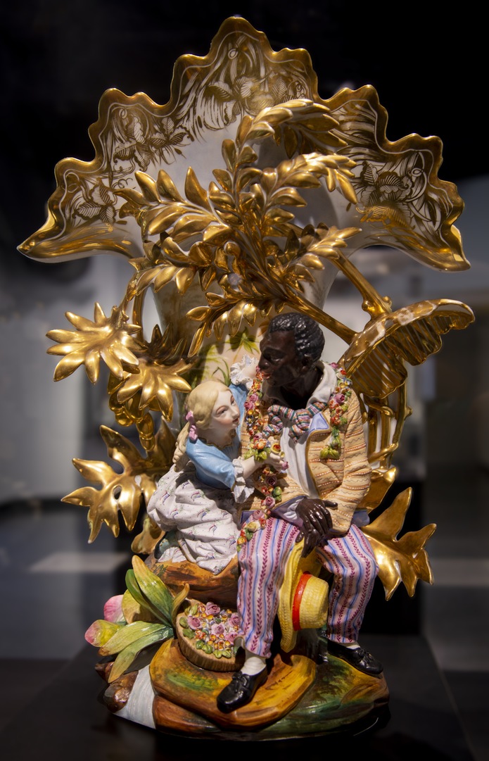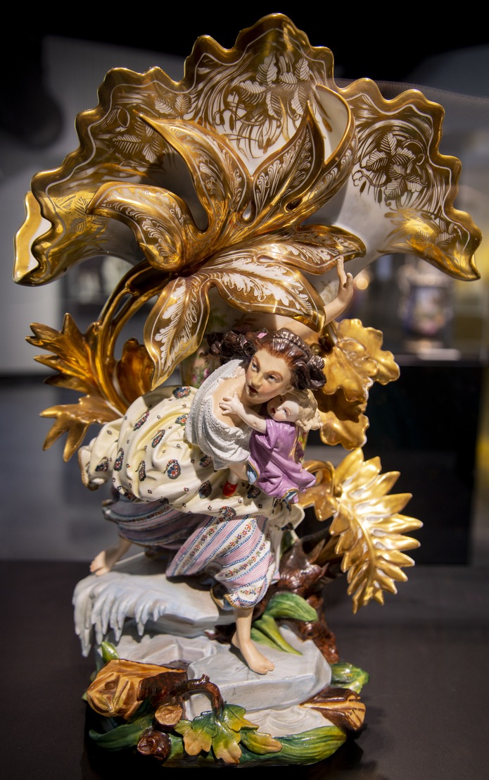 Spain, 1995: Lladro, being a more modern company, prominently advertises the name of the creator, a detail that is lost to time for several other porcelain artists. Antonio Ramos’s Allegory of Spring makes such an impact among the rest of the Lladro pieces because of the sense of movement it conveys. Another detail that sets it apart are the applied floral sprigging detail on the two women, which have more vibrant color than the rest of the glazes used in the works beside it. This piece is from Spain and was crafted in 1995. Originally, the founders of Lladro were inspired by the other European masters of the craft, Meissen, Sèvres, and Capodimonte, all of which are featured at MOAS in one form or another. Lladro, a maker of highly collectible porcelain art, opened its doors in 1953, making it the most contemporary of the manufacturers in the collection. It sports a history of having its own collector club established in 1985.[11]
