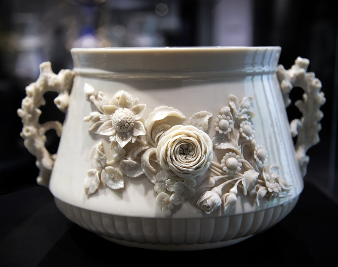 Northern Ireland, 1895: In a North Irish village on the banks of the Erne River is the home of the Belleek Pottery Company,[10] where the Finner Flower Pot was created ca. 1895. Despite the lack of vibrancy, the flower pot is one of my favorite pieces in the collection. This piece of white-throughout porcelain might at first seem to lack the vividness of the other pieces in the collection, but in fact, it showcases a specific type of pearly glaze that gives it shine. It is because the flower pot isn’t overtaken with color that the thinness of the flower petals stands out so well, each slightly thicker than the width of a sheet of paper. The technique of attaching pieces like the artist has done with the flowers is called “sprigging.” The detail of the coral handles is an homage to the proximity of the water to the place the pot was crafted. The combination of the glaze and the thin porcelain made Belleek rise in popularity. It is still in production today.