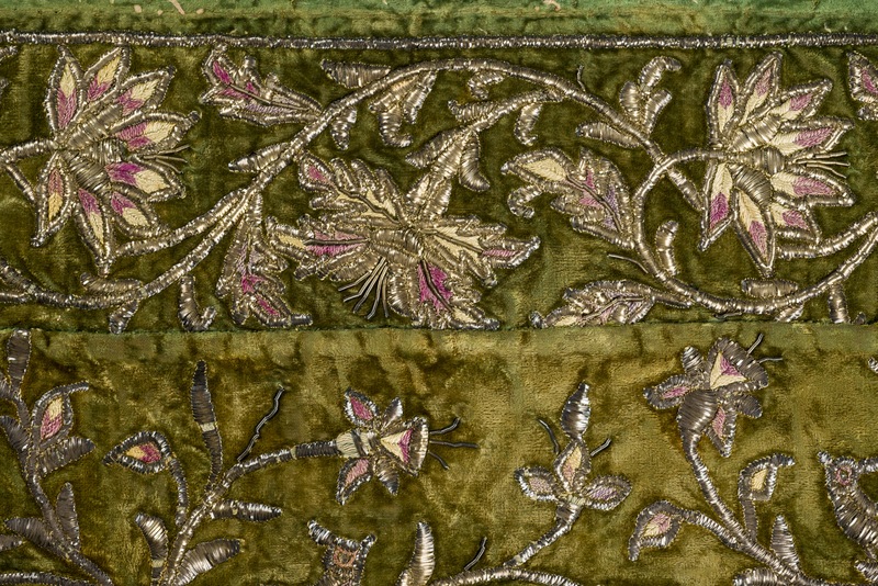 Velvet Embroidery (detail); possible garment fragment, silk velvet with metal and silk embroidery; 19th Century, Kashan Region, Iran, 18 x 21”