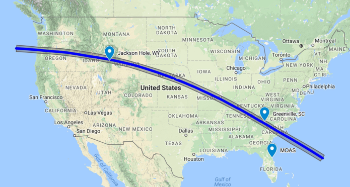 This map illustrates the path of totality where the 65-mile wide shadow of the Moon cut through the heart of the U.S. on August 21st. The blue markers indicate where Jason Schreiner (Jackson Hole, WY) and Seth Mayo (Greenville, SC) observed the total solar eclipse that day.