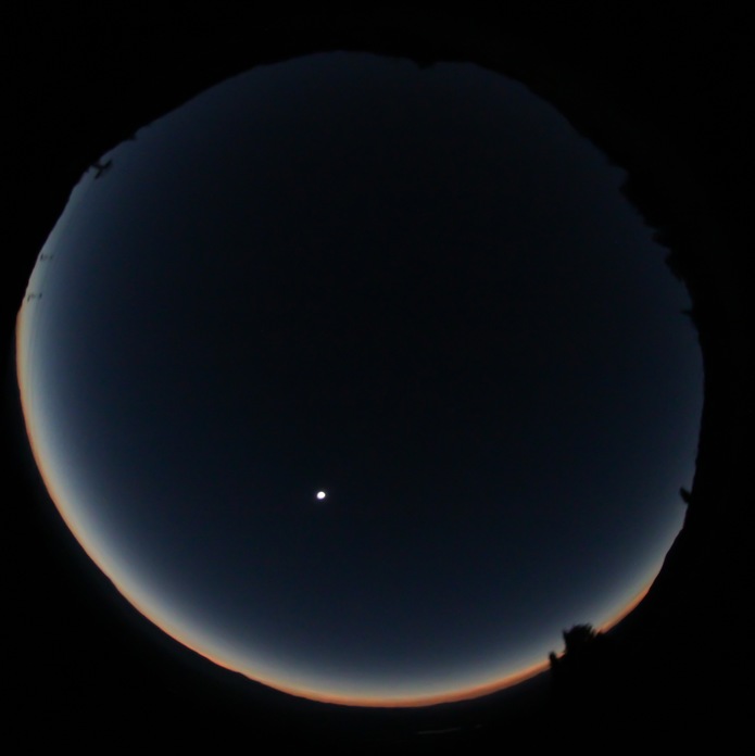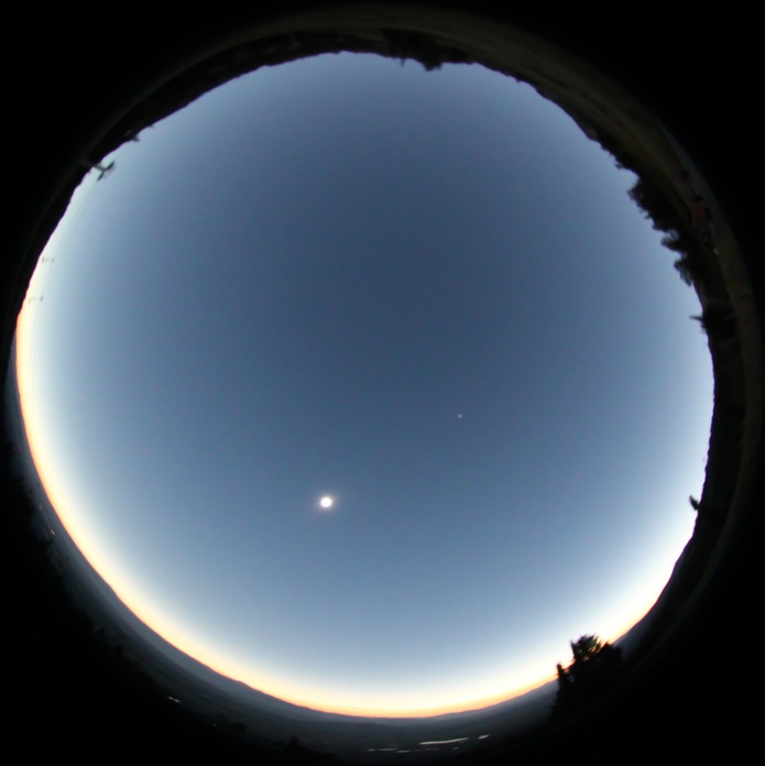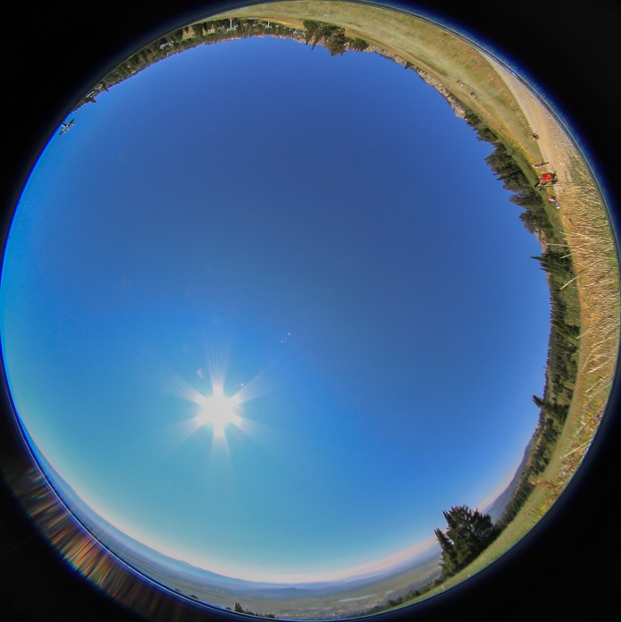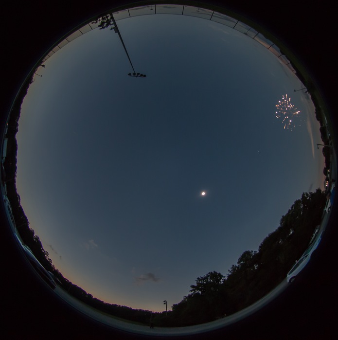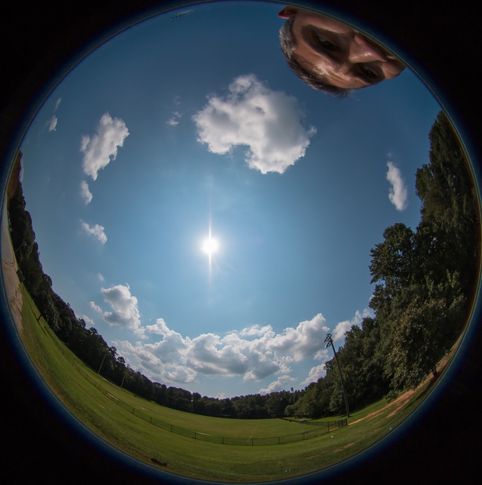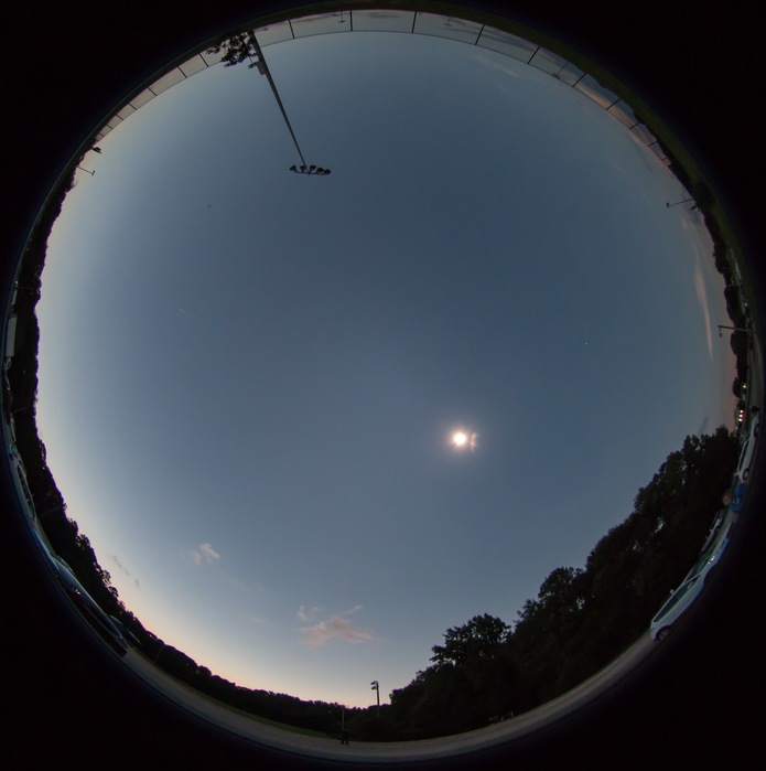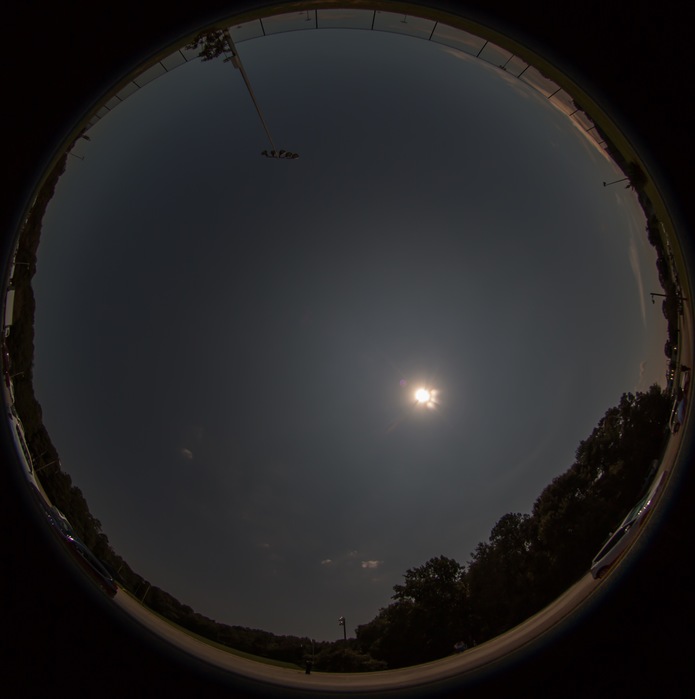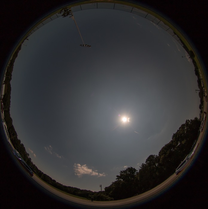 Seth Mayo: My original game plan was to travel to Charleston, SC to witness the eclipse. However, astronomer's luck was in full effect with poor weather forecasted. I made a last minute change and traveled to clearer skies in Greenville, SC, and captured this wide-angle fish-eye shot (formatted for hte planetarium dome) of an open park that I discovered to be empty with my own face caught in the moment. Even though this was more than two hours before totality, my intention for this shot was to provide a view of the color temperature of the sun's light on the ground before the dramatic environmental changes occured.