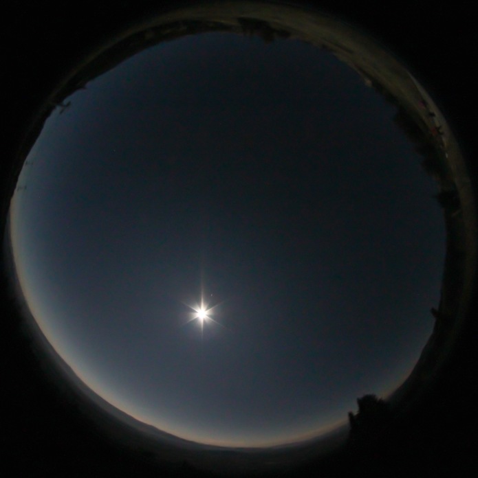 Seth Mayo: As the moon closed in on the sun, I was overwhelmed by the dramatic changes to the environment all around me. The usual intensity of the sun quickly diminished, zapping the brightness out of the sky. One of the first objects I noticed was Venus, located midway between the sun and the right edge of the image. A subtle reddish glow began to appear all along the horizon that revealed the sun's usual brightness shining outside the path of totality. While the light was fading quickly, I was amazed to hear crickets beginning to chrip their usual nightly songs in the middle of the day.