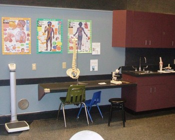 This station allows children to learn about the human body. After entering a life-like doctor’s waiting room, children can sign in at a typical doctor’s reception desk and enter a doctor’s office. They can weigh themselves, check their height, read an eye chart, learn about nutrition and look through a microscope at representative human cells. The exhibit contains professional models of the human skeleton and heart, among others.