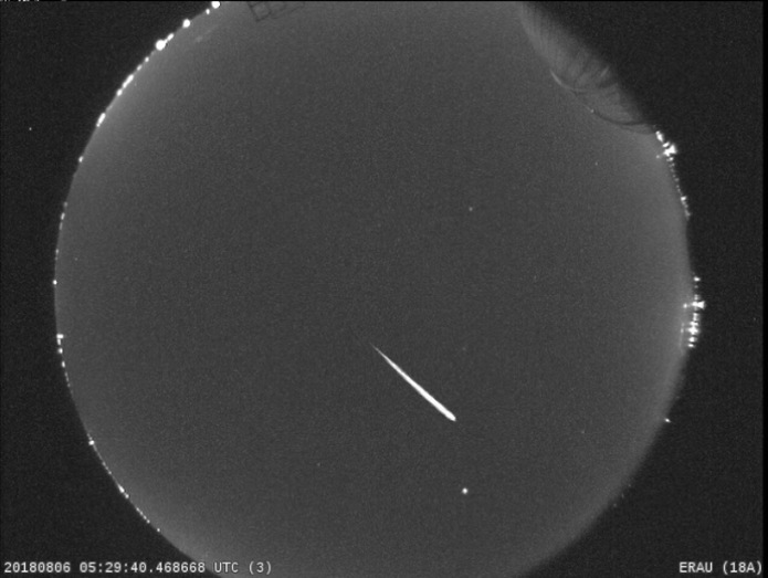 A Perseid meteor was caught in an all sky camera at Embry-Riddle (ERAU) in Daytona Beach as it streaked overhead. A bright meteor such as this is called a fireball, and this particular one was seen in August of 2018 as it was moving at about 132,000 mph. The all sky camera at ERAU is part of NASA's All-sky Fireball Network under the Meteoroid Environment Office and is collecting data on meteors over Earth to aid in spacecraft design and safety. Image credit: NASA/MEO