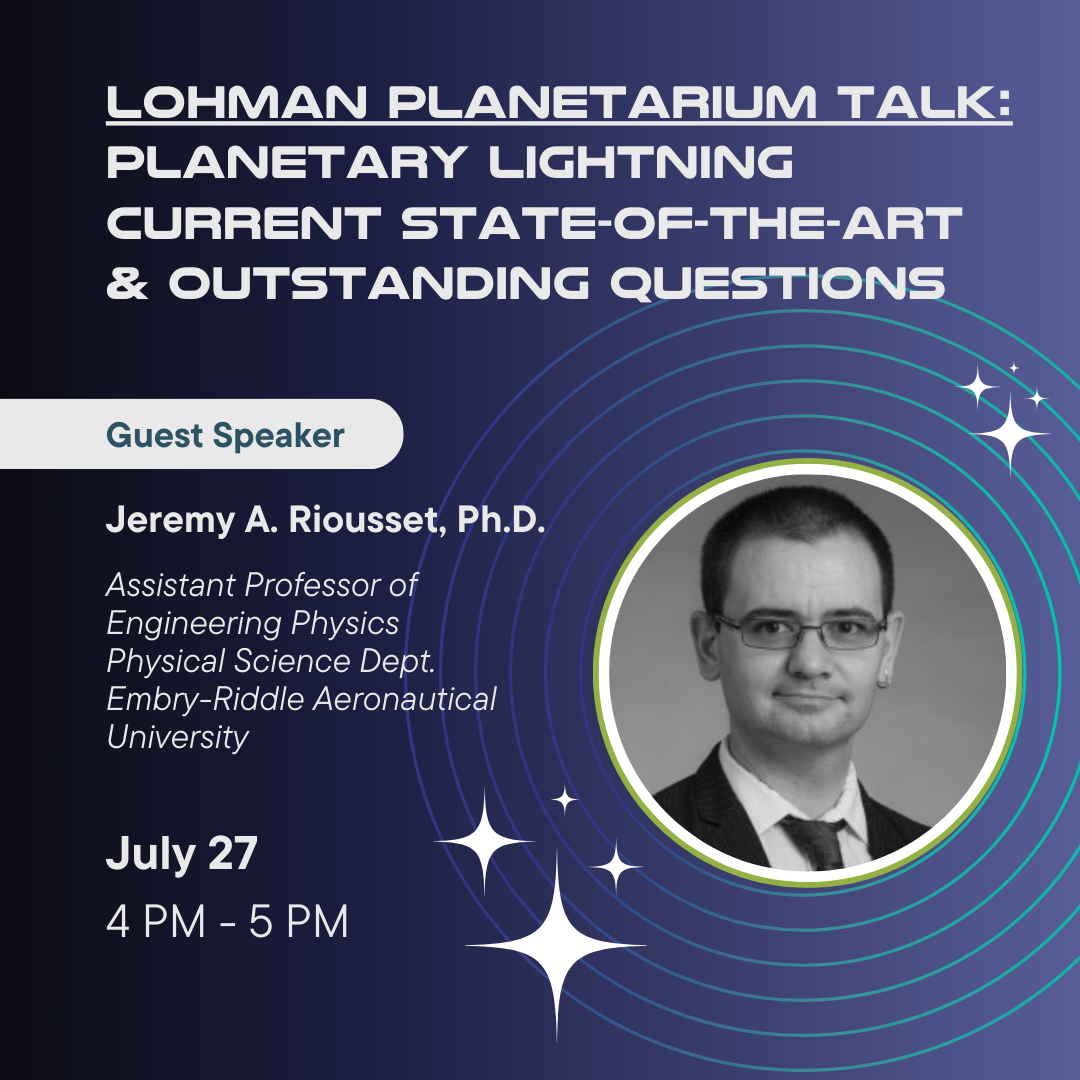 Join us in the Lohman Planetarium on Saturday, July 27 | 4:00PM - 5:00PM for a special pop-up talk with ERAU's Jeremy A. Riousset, Ph.D., Assistant Professor of Engineering Physics | Physical Science Department.