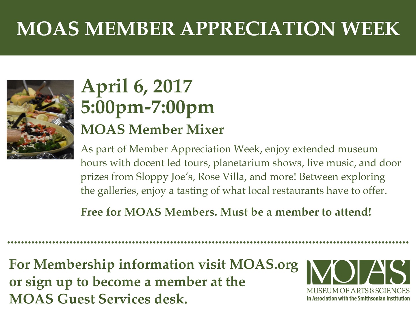 As part of Member Appreciation Week, enjoy extended museum hours with docent led tours, planetarium shows, live music, and door prizes from Sloppy Joe’s, Rose Villa, and more! Between exploring the galleries, enjoy a tasting of what local restaurants have to offer. Restaurants such as Blau Grill, Cakery Creation, Creations Catering, Good Humor Ice Cream, Greentown Taverna, Gold Leaf Coffee Co., Ormond Brewery, Steel Oak Coffee, Tomoka Brewery, and Victory Popcorn will host stations providing free samples of their specialties.