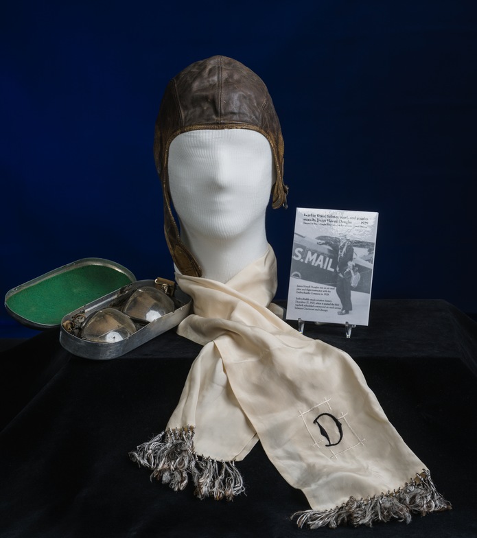 These articles of pilot gear date back to 1928, and were worn by James Howell Douglas, who joined the Embry-Riddle company as an airmail pilot and flight instructor. Before his tenure at the Embry-Riddle company, Douglas served in World War I and spent time afterward in the National Guard, first as a mechanic, and eventually becoming a military pilot. He was later promoted to 1st Lieutenant, where he supervised engineering, maintenance, and operations of the 105th Observation Squadron.