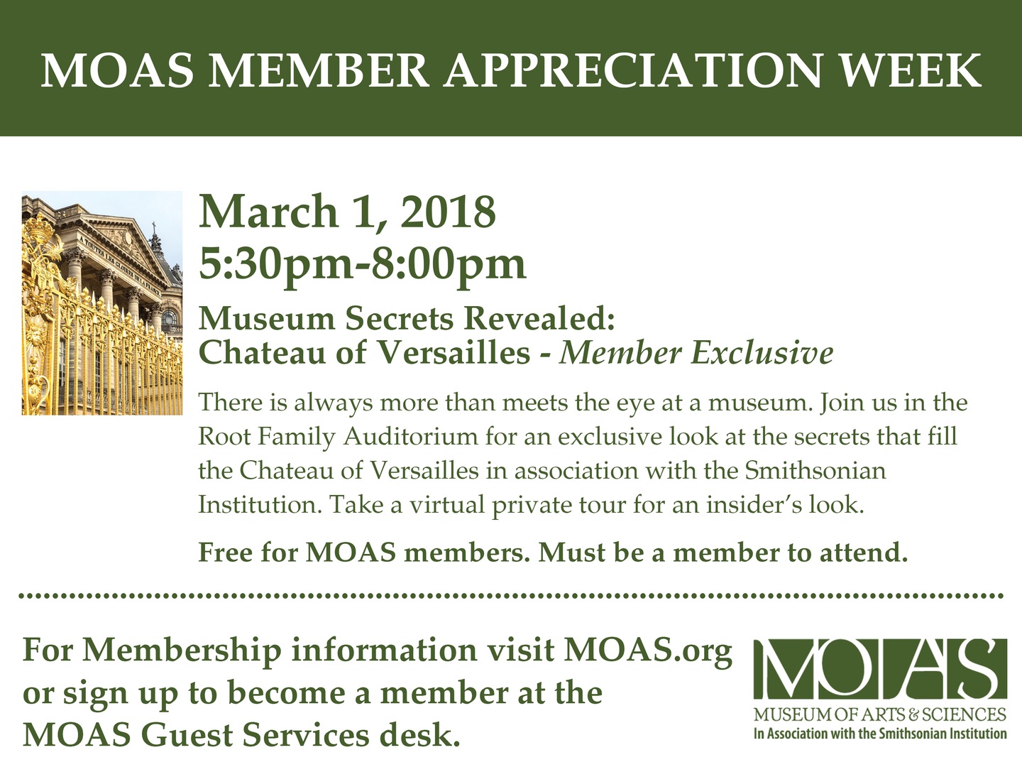 There is always more than meets the eye at a museum. Join us in the Root Family Auditorium for an exclusive look at the secrets that fill the Chateau of Versailles in association with the Smithsonian Institution. Take a virtual private tour roaming the galleries to get an insider's look, revealing countless secrets. Enjoy light hors d'oeuvres and a cash bar throughout the evening. Kindly RSVP by February 22 by calling 386-255-0285 ext. 315 or by emailing membership@moas.org.