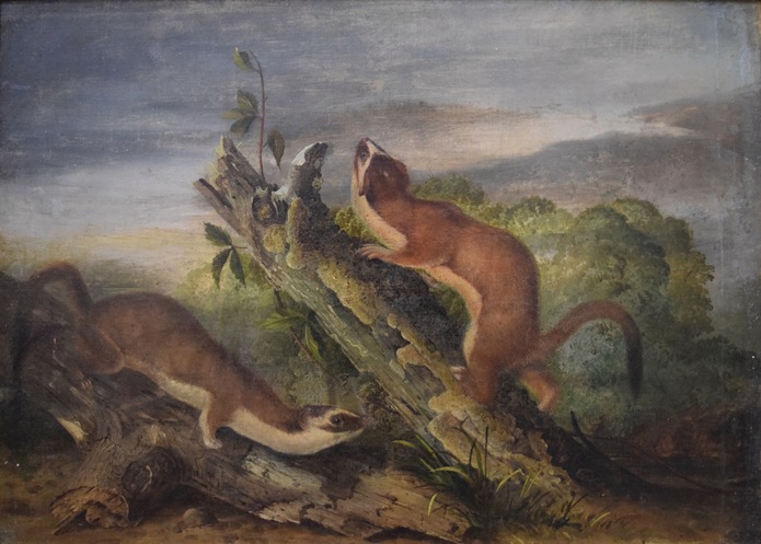 In the Dow Gallery of American Art, you will discover an amazing oil painting by John James Audubon titled, Townsend’s Weasels 1842, an oil on canvas. Audubon, the great painter, and printer of the Birds of America created our country's most famous art book. He was an artist-naturalist who raised bird portraiture to a fine art. After Audubon became famous for his Birds of America, he and his son, John Woodhouse, took on a new challenge in the early part of the 1840’s to paint and describe all of the mammals of North America. The book entitled, The Viviparous Quadrupeds of North America, contained some 150 images but is smaller in scale. Audubon did not render many oil paintings, and when he did, it was to raise money to enroll subscribers for his art books. This painting is a preliminary study for a plate in Audubon’s second volume of nature studies for this series. The Museum’s Townsend’s Weasels, 1842 was a gift from Miss Mary Eliza Audubon (John J. Audubon’s granddaughter) to Rosalie Paul. Rosalie lived with the Audubon’s and attended the school in their home off Riverside Drive, New York. They called her their adopted daughter. This oil painting was a wedding gift to Rosalie at the time of her marriage. The fact that the Museum owns and displays an original Audubon oil painting is quite remarkable. Townsend was Audubon’s trapper and he painted this oil painting depicting two weasels in a playful disposition. It is actually the same male weasel painted twice. What makes this piece a one-of-a-kind is that if you look closely at the weasel in the lower left section you will see it has two tails. Originally, Audubon did not like the placement of the original tail so he painted over it and placed a new tail higher up on the hip. Now, over the many years, the original paint has shown through a process called pentimento and now shows the glaring mistake of two tails on this weasel.