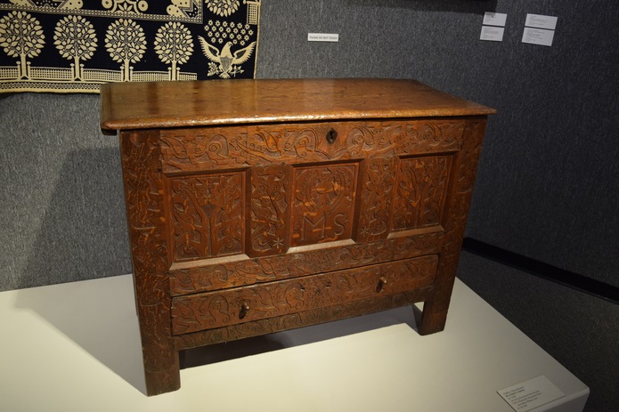 In the 17th century, a person known as a joiner was also known as a cabinet maker. The word carpenter was not in popular usage until the 1800’s. Chests were usually made to order and sometimes they were initialed when bestowed as gifts. On display in the Dow Gallery of American Art is a beautiful 1694 dowry chest with the initials MS. This rare pilgrim chest is a Hadley Chest named after the location it was discovered (Hadley, Massachusetts), and there are less than 150 of them known to exist. They were discovered by a collector in 1898 and were created by cabinet makers within a 750-mile area. The initials stand for Mercy Smith who the piece was originally commissioned for. This oak chest stands 3 ½ to 4 feet tall and has a pine top. Kenneth Dow purchased this rare chest in 1939, and now it sits at the entry of the gallery as a sentinel to the beginning of a long and glorious history of American cabinet makers.