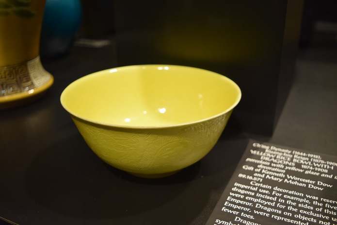 In The Helena and William Schulte Gallery of Chinese Art sits a small yellow porcelain rice bowl. It appears simple but it is actually incredibly important. It is one of the rice bowls belonging to the court of the last emperor of China, Aisin-Gioro Pu Yi (b. 1874- d. 1912). In Chinese culture, the color yellow is long associated with royalty. This color was reserved exclusively for the emperor. The emperor even wore yellow robes. Also, etched on the side of this rare artifact is a five-clawed dragon. This symbol was also reserved only for the emperor. A dragon with four claws was reserved for nobles and three-clawed dragon for commoners.
