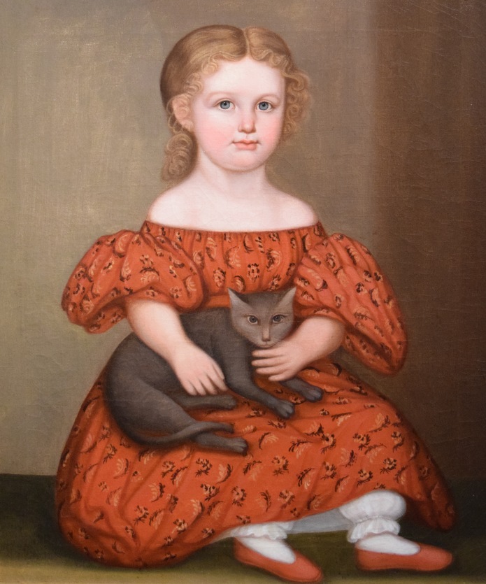The Portrait of Miss Perkings is a painting by Joseph Whiting Stock, a prominent American artist during the 19th century who was known for his portraits and miniatures. Stock's life was filled with hardships, as he was handicapped at a young age and had several health issues throughout his short life. Despite this, he found joy in painting and made his living off of it. His portrait of Miss Perkins displays his use of vibrant colors and his unique style of painting children. He often had them sitting and holding a prop of some sort, in this case, a cat. This position allowed him to create an illusion of a third dimension and earned him a reputation as a portrait artist for youth. With only about 100 of his works known today, the Museum is proud to have one of his portraits.