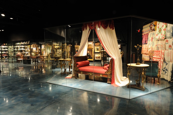 The Visible Storage Building serves both as a storage and an exhibit, displaying thirty percent of the Museum's objects. This feat is achieved by using a glass enclosure and by organizing the pieces so that they can be admired, yet easily accessible. The collection contains Napoleonic artwork, such as furniture, sculptures, and personal items.
