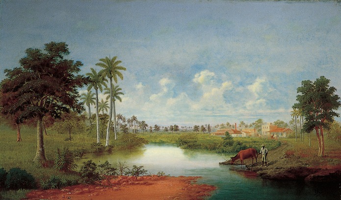 The key feature of Cuban landscape painting is the integration of Cuban culture and life within the "place" of the painting. One of the fathers of this idea is Miguel Arias, whose painting, Cuban Landscape, is a wonderful representation of this style of painting. Although the majority of the painting is of Cuban agriculture and water, it is the other details that bring it to life. Arias included a farmer watering his horse near the front of the painting. In the back, he paints an ingenio, or a sugar plantation and mill, which was an important aspect of Cuba's economy. Arias' inclusion of these details connects Cuban landscape to Cuban life and culture in a seamless way.