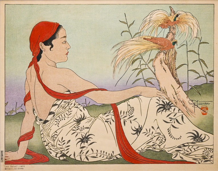 Paul Jacoulet (1902-1960) designed a remarkable set of woodblock prints that are beautifully composed, visually exciting, and masterfully produced. This group of 47 of the original prints - about a third of his total output - demonstrate, not only Jacoulet's interest in exotic subjects but also the remarkable range of techniques and unsurpassed skill his carvers and printers used to achieve the images. Using the centuries-old process of Ukiyo-e carving and printing, Jacoulet and his printing team created fascinating portraits of South Sea and northern Asian individuals with many cultural and geographic details to indicate their heritage and location. Jacoulet did not compromise on quality. He used only the best paper and inks. Though he used traditional processes, his images are modern. His works reflected little of the artistic trends of the time but beautifully synthesize Japanese and French aesthetics. Image Credit: Les Paradisiers Menado, Celebes, 1937, woodblock on paper