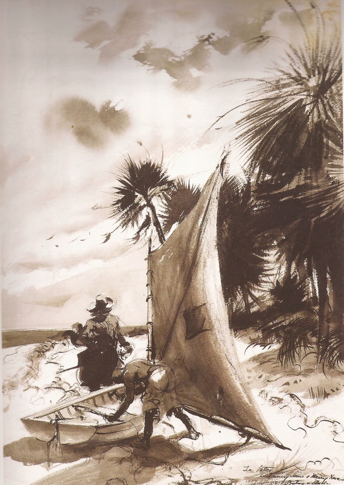 It is painted by Andrew Wyeth, the youngest son of the famous N.C. Wyeth, the great illustrator of Treasure Island. Andrew’s teacher was his famous father and he gained an impressive national reputation as a great artist apart from his father. In his painting, The Landing Party ca. 1930, rendered in ink on paper, Wyeth depicts two pirates dragging their skiff on a Florida sandy beach. The black and white image shows several typical Florida cabbage palms in the background and clouds gathering above them. The pirate who is walking away from his skiff appears to be dressed as if some type of captain with a long sword. The scene depicts a romantic version of pirates on a faraway beach, the type of image most of us have grown up with.