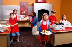 Our pepperoni is no phoney baloney! Well actually it is. This exhibit provides a space where our young guests can imagine they are operating a pizza restaurant. They can create soft sculptures of pizza using real pizza pans and peels, bake a pizza in a lighted brick “oven,” ring up the order on a cash register, and serve customers seated at café tables. This experience encourages creativity and cooperation while building essential math and life skills.