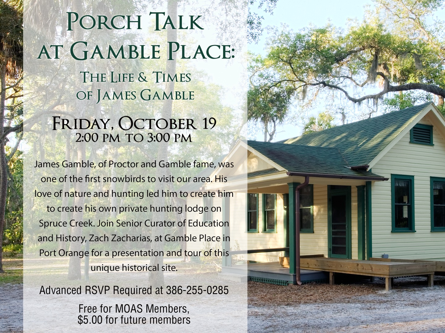 James Gamble, of Proctor and Gamble fame, was one of the first snowbirds to visit our area. His love of nature and hunting led him to create his own private hunting lodge on Spruce Creek. Join Senior Curator of Education and History, Zach Zacharias, at Gamble Place in Port Orange for a presentation and tour of this unique historical site.