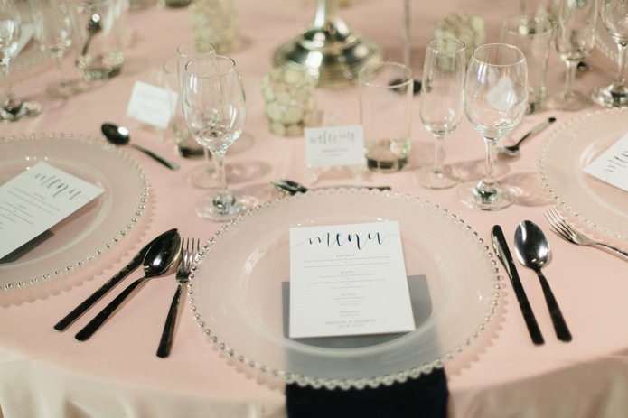 Provided by Florida Wedding Supplies, blush and deep navy fabrics draped the tables and softened the look in Root Hall. Delicate beaded chargers and artistic votive holders added a simple romantic touch to the overall space.