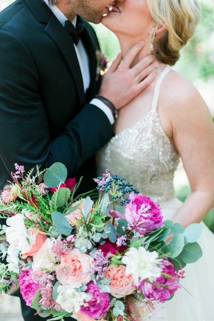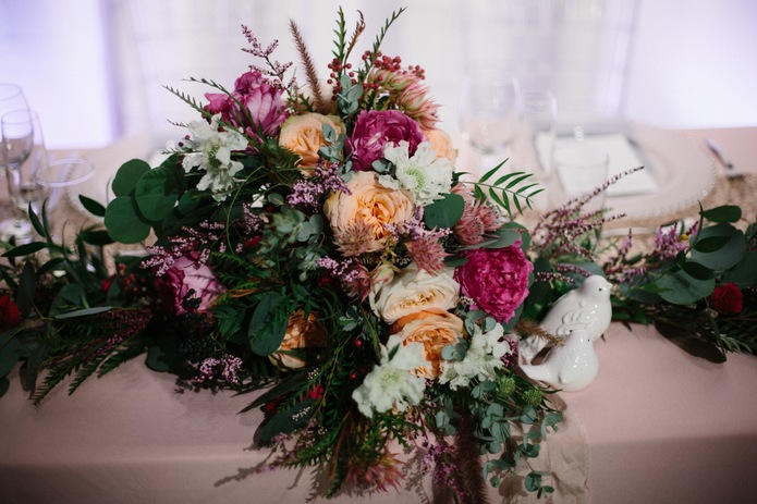 Foxhound Floral absolutely wowed us with the florals. Gracing the table with bolder hues of rose, plum, honey yellows, crimson, whites, and greenery, the florals were art in their own right! The bride’s bouquet was nothing short of a wandering lush bold arrangement. The bouquet is bold, large, romantic, and serves a dual purpose as it finds its home on the sweetheart table giving it the attention it deserves.