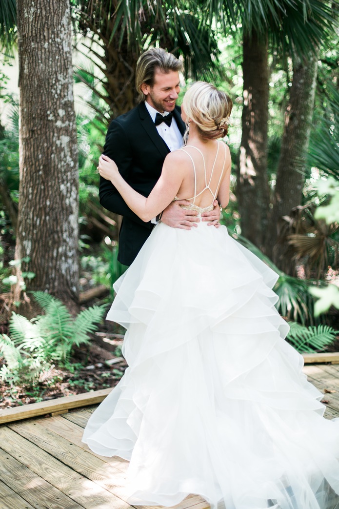 The bride and groom models are a real married couple! That steamy chemistry you see is the real deal. The bride glides in a Wtoo Kennedy gown in prosecco color by Lola Grace Bridal. The all-over Estera sequin motifs on the sleek fitted silhouette sparkle under the studio lights, while the voluminous layers, airy ruffled skirting, and romantic chapel train allow her to float as if in the heavens. Our groom wears a Michael Kors Ultra Slim Sterling Wedding Suit by Jim's Formal Wear. They are a perfect fit for an elegant night of the arts, and it’s even better that Lola Grace Bridal is your one stop source for both looks!