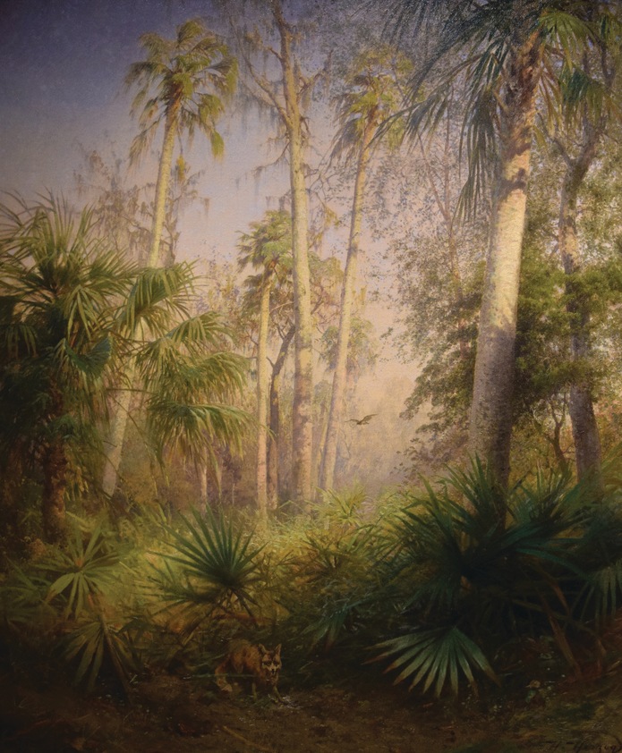 Other prominent artists in the collection representing the legacy of European Romanticism include Herman Herzog and Martin Johnson Heade. Born in Bremen, Germany, Herzog was originally drawn to the natural splendor of the mountains and the German terrain. The sublime and untamed elements of the wilderness became a significant driving force behind his decision to pursue landscape painting. Once transplanted to the U.S. and, eventually to Florida, he focused his reverent eye on the lush landscape of the state’s interiors. While appearing literal and almost photographic at first glance, one realizes the awe the painter felt for these tropical scenes in works such as The Fox, Near Gainesville, ca. 1880 where the towering palms dwarf the tiny fox and bird flying through the center of the composition. The tops of the trees are cut off in the painting, implying that they are even taller and most majestic than rendered here. The viewer’s vantage point is at the level of the frightened fox at the bottom of the composition, and we are reminded of the power of nature as they these long trees tower above us and the dense underbrush seems to teem with life.